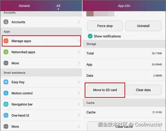 - EMUI 版本很重要: 早期 EMUI 版本(5.0 以下)可能支持通过系统设置将应用程序移动到 SD 卡。