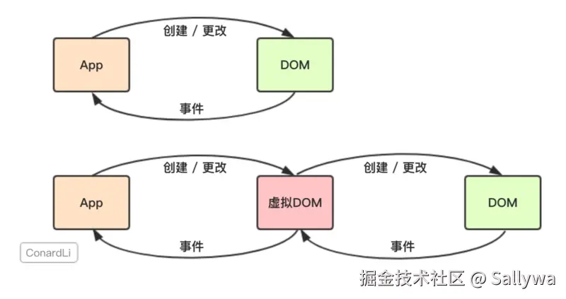 Virtual DOM 本质上就是在 JS 和 DOM 之间做了一个缓存。可以类比 CPU 和硬盘,既然硬盘这么慢,我们就在它们之间加个缓存:既然 DOM 这么慢,我们就在它们 JS 和 DOM 之间加个缓存。CPU(JS)只操作内存(Virtual DOM),最后的时候再把变更写入硬盘(DOM)。