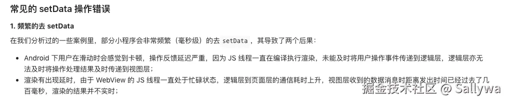 - 小程序是没有批处理的,也就是说小程序的setData是一个同步行为,所以在setData的时候尽量一次性更新完成,不要多次调用setData