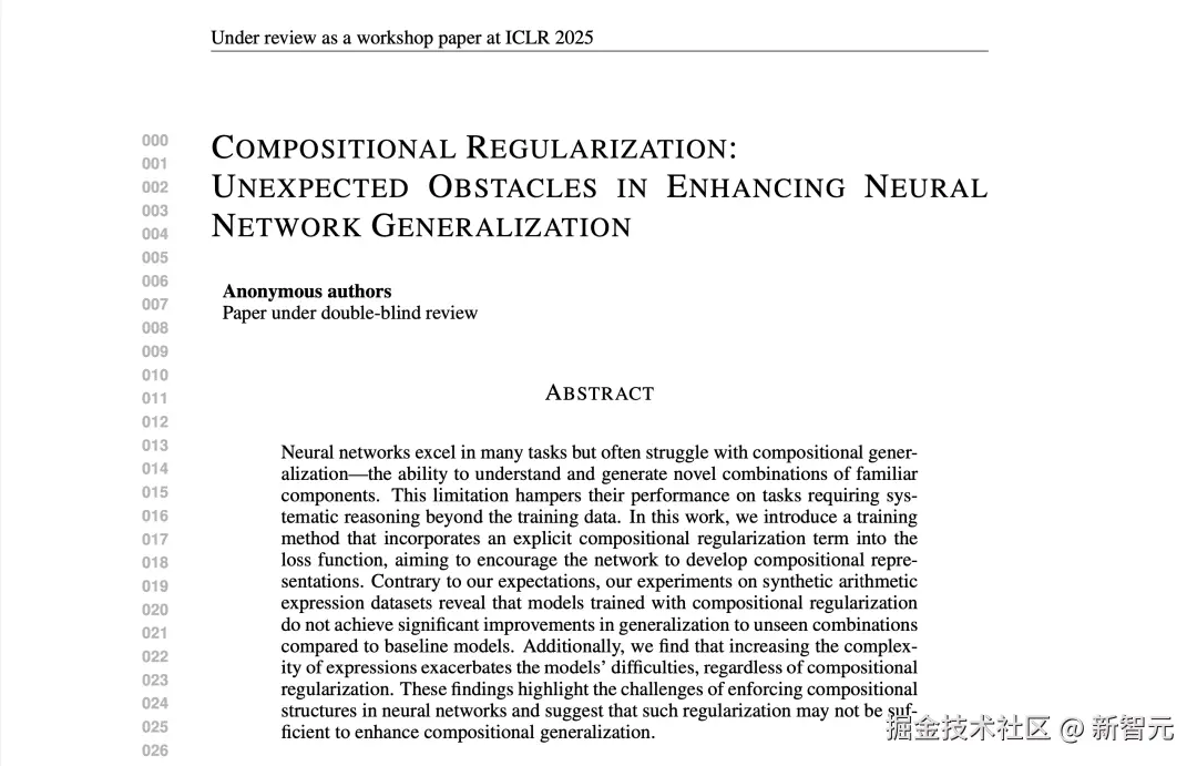3 篇论文中,只有一篇 Compositional Regularization: Unexpected Obstacles in Enhancing Neural Network Generalization,平均获 6.25 的高分(6,7,6,6),远高于许多人类作者的论文。