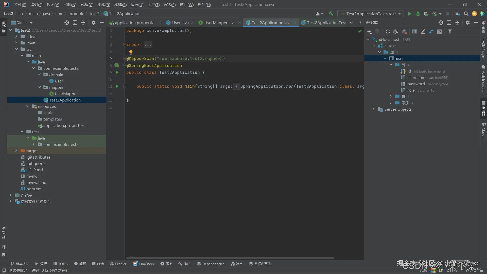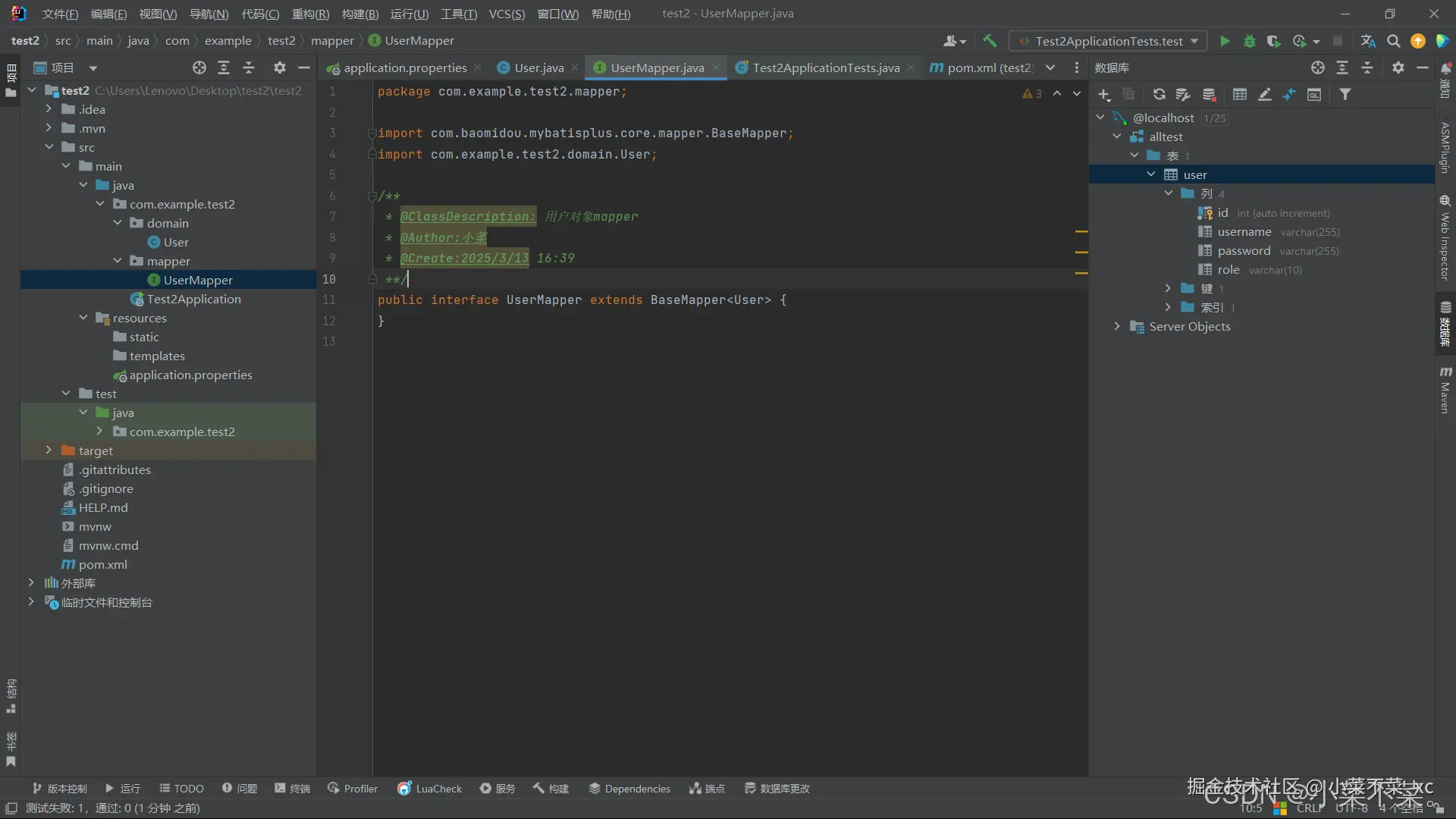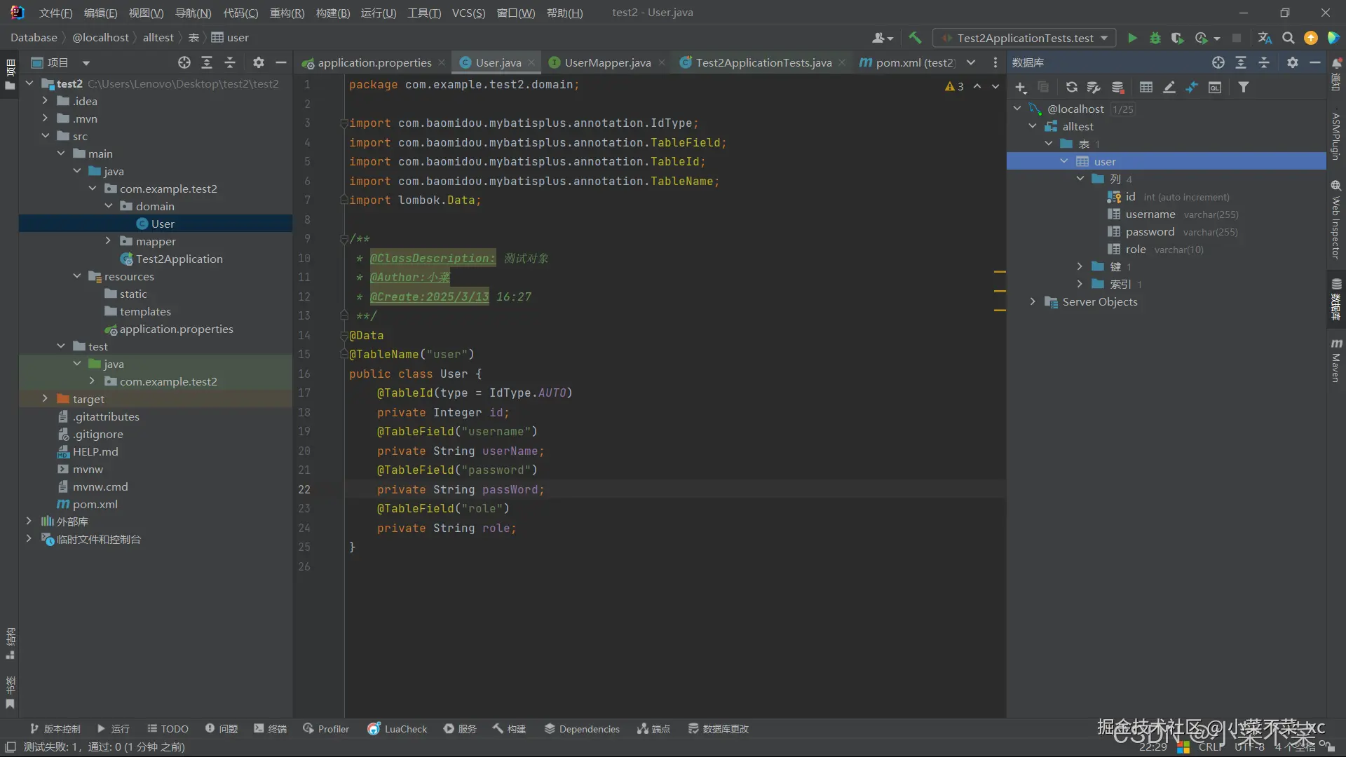 编写实体类,使用@TableName("user")注解匹配数据库的对应表,以及各个键要与数据库进行对应
