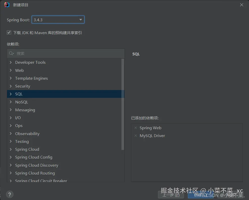 在一开始选择依赖的时候,可以选择一些必要的依赖,同时后续也可以在pom文件中添加