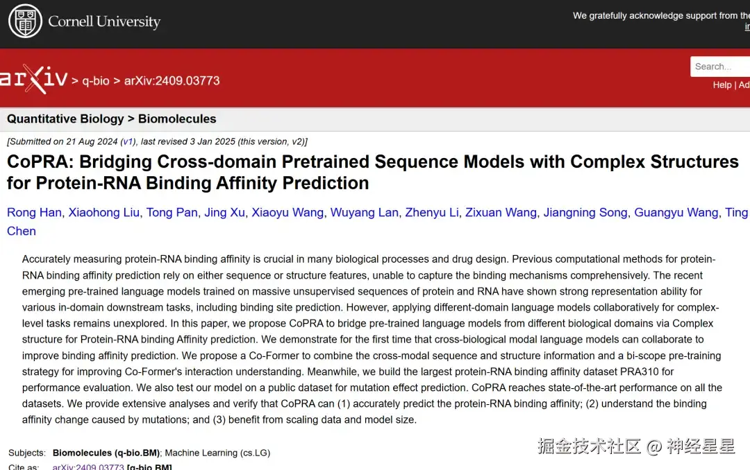 相关成果以「CoPRA: Bridging Cross-domain Pretrained Sequence Models with Complex Structures for Protein-RNA Binding Affinity Prediction」为题,已发布预印本于 arXiv。