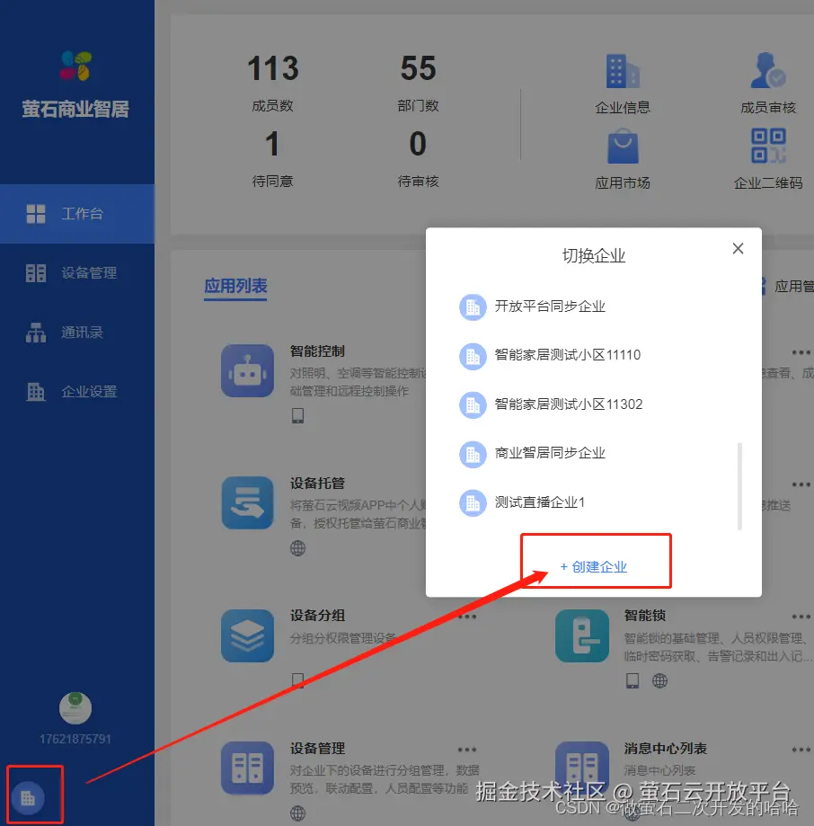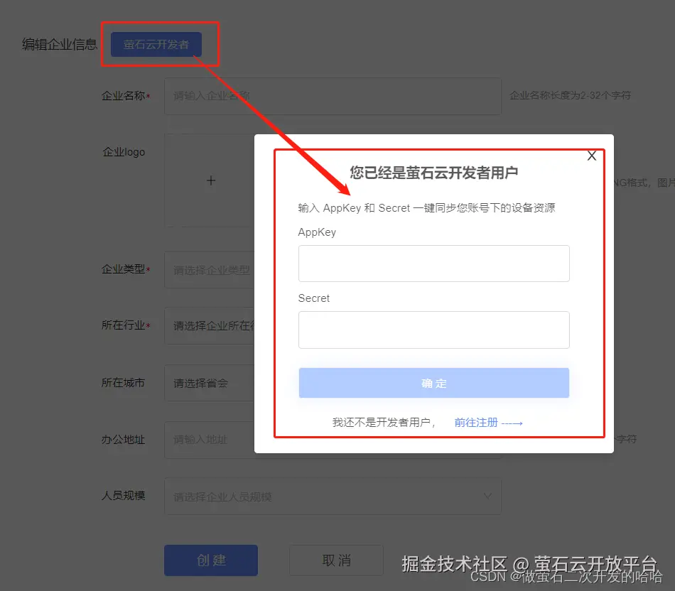 第三步:注册萤石商业智居企业,并绑定开发者账户:es.ys7.com/home/workbe… Web 端注册)