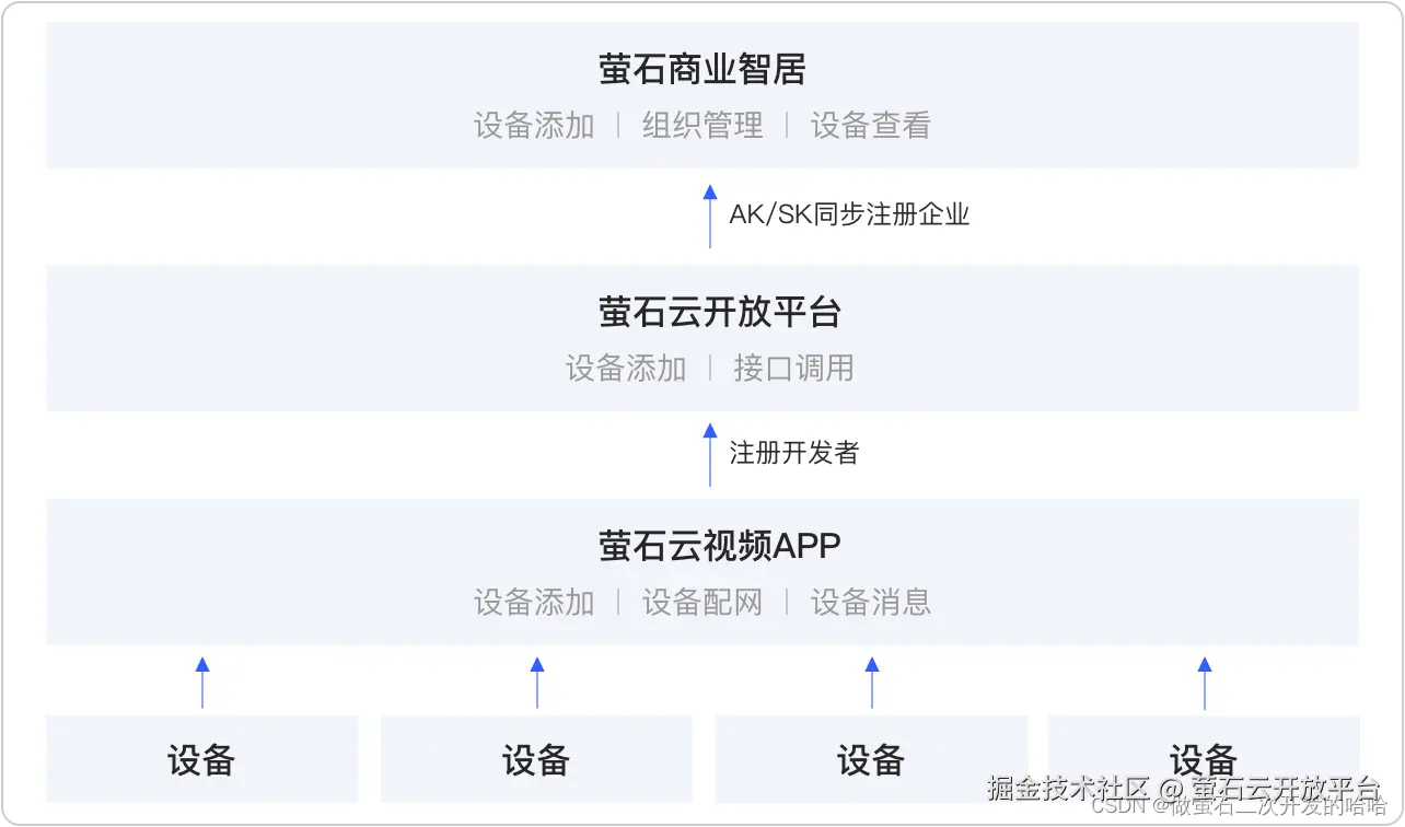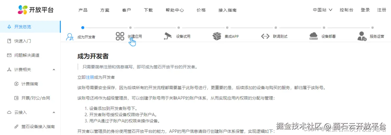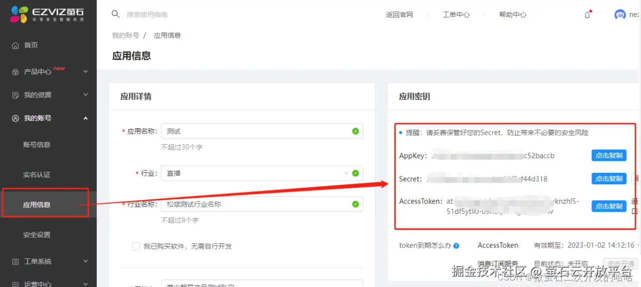 注:这里也可以是萤石云视频 APP 的用户,升级成为开发者。申请应用后,获取到开放平台的 APPkey,APPSecret。