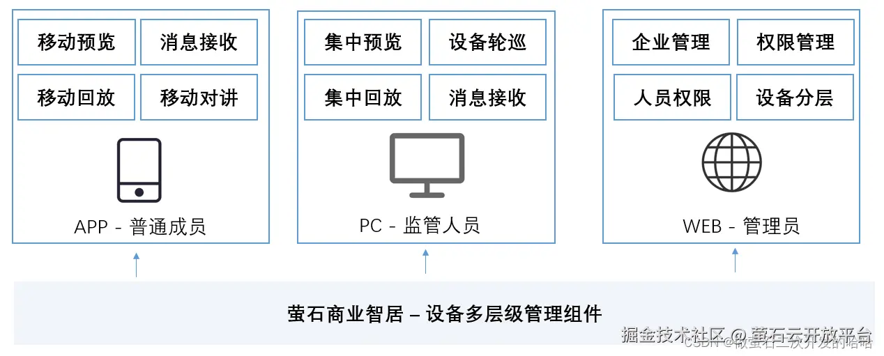 萤石组件整体涵盖 APP,PC,Web 三端,主要是为不同角色提供不同的服务。APP 端为普通成员提供便捷的移动预览,随时接受设备告警消息,远程查看录像回放,远程语音对讲功能,也为管理员提供了组织层级、成员的部分管理功能。PC 端为管理员提供接受设备告警消息、多屏预览、多设备轮巡、多设备查看回放、远程语音对讲功能。Web 端为管理员提供管理组织成员、组织层级、设备层级,提供批量的管理功能。