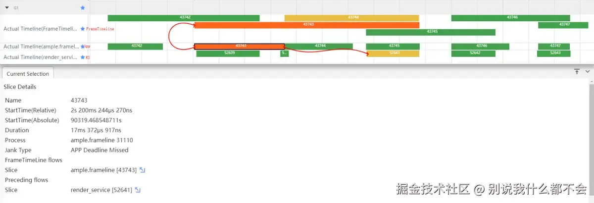 从图5和图6结合来看可以确定场景示例明显属于App侧的帧卡顿。点击卡顿帧进行详细分析,相应的关联帧会通过线连起来,同时在Current Selection显示它的Details信息,如图7。
