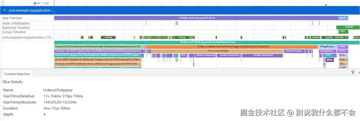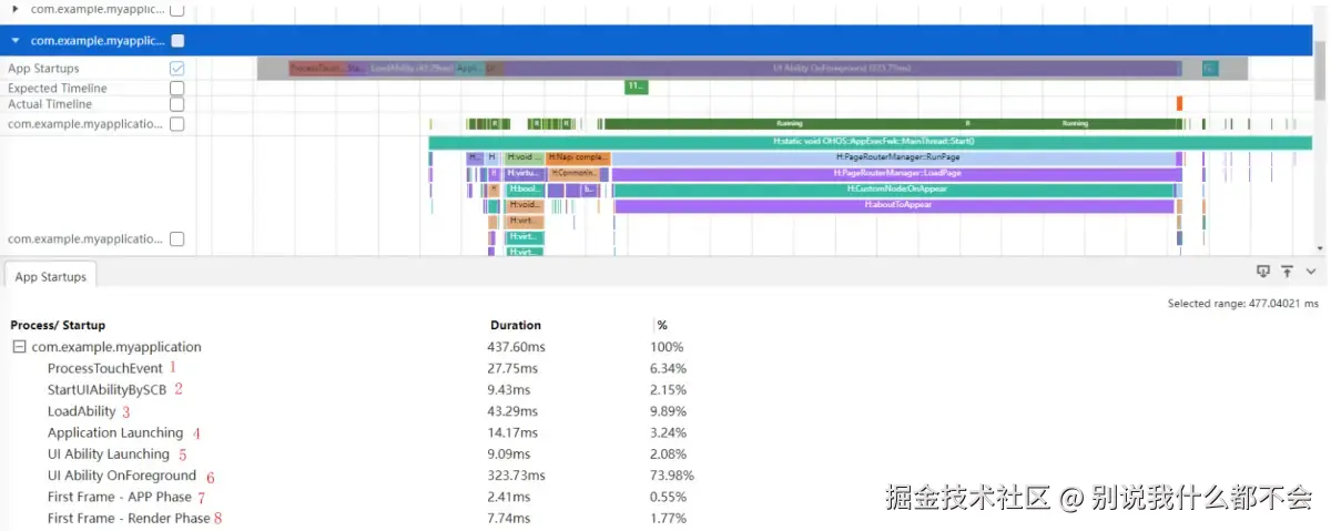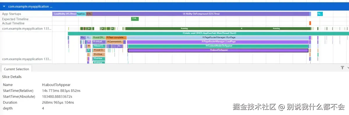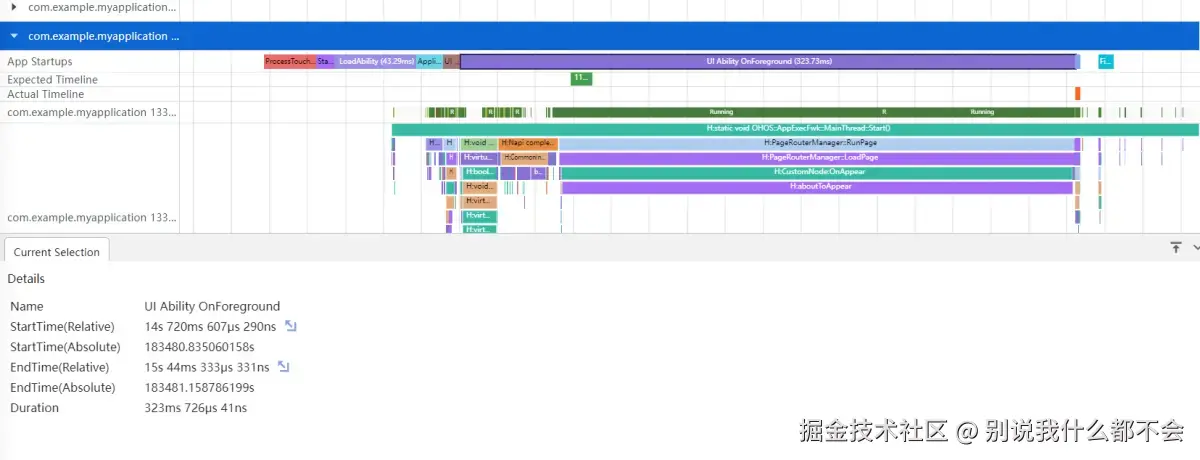 上图展示结果显示,执行耗时最长的是UI Ability OnForeground阶段。目前耗时Duration为323ms。