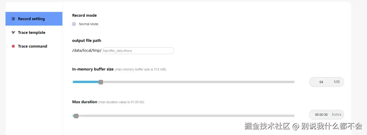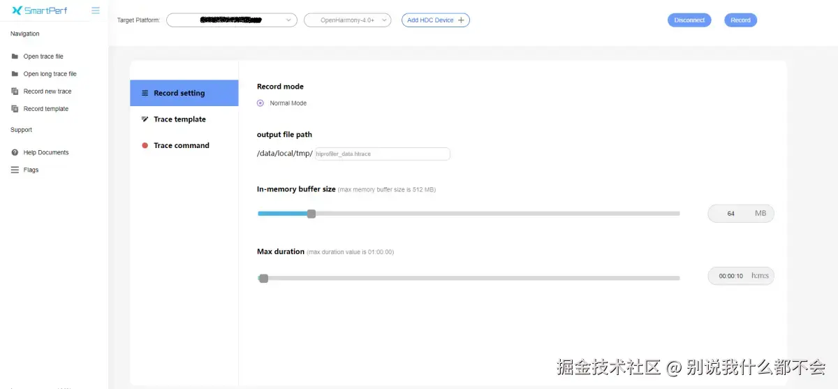 - 点击右上角Record开始抓取,同时在设备上复现应用掉帧或卡顿的操作过程,抓取完成后页面会自动加载trace数据。