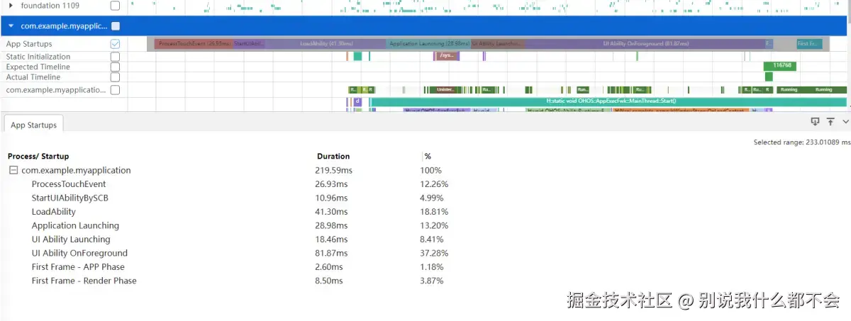 展开对应应用的泳道,找到应用启动时的时间段。选中AppStartup泳道全部阶段,可以在下方详情内看到具体阶段的耗时情况。