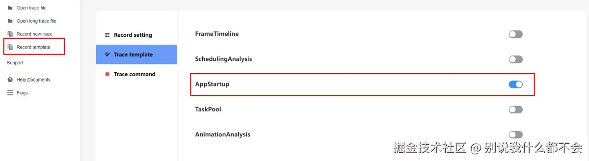 - 切换到Record template页面,点击Trace template,开启AppStartup。