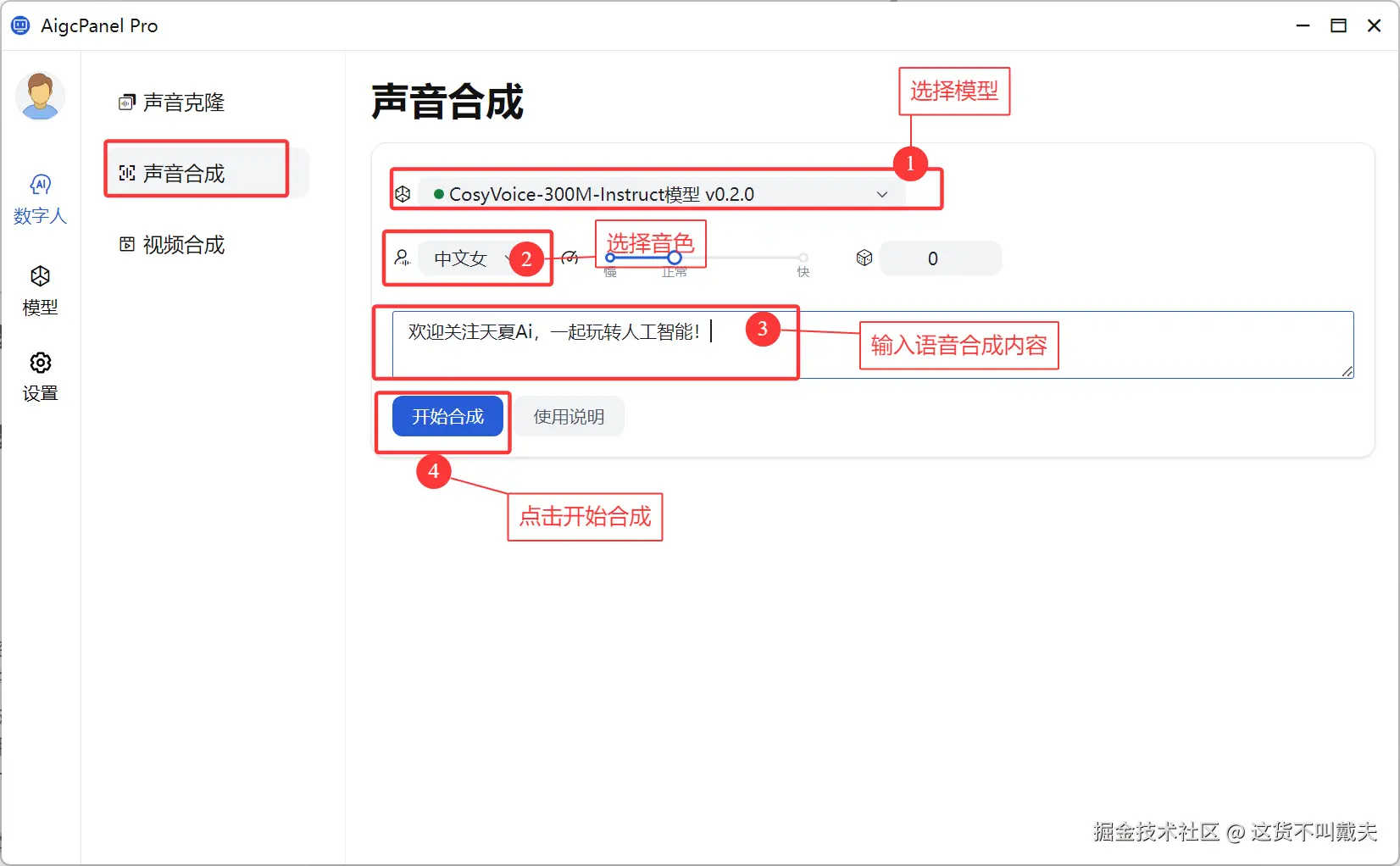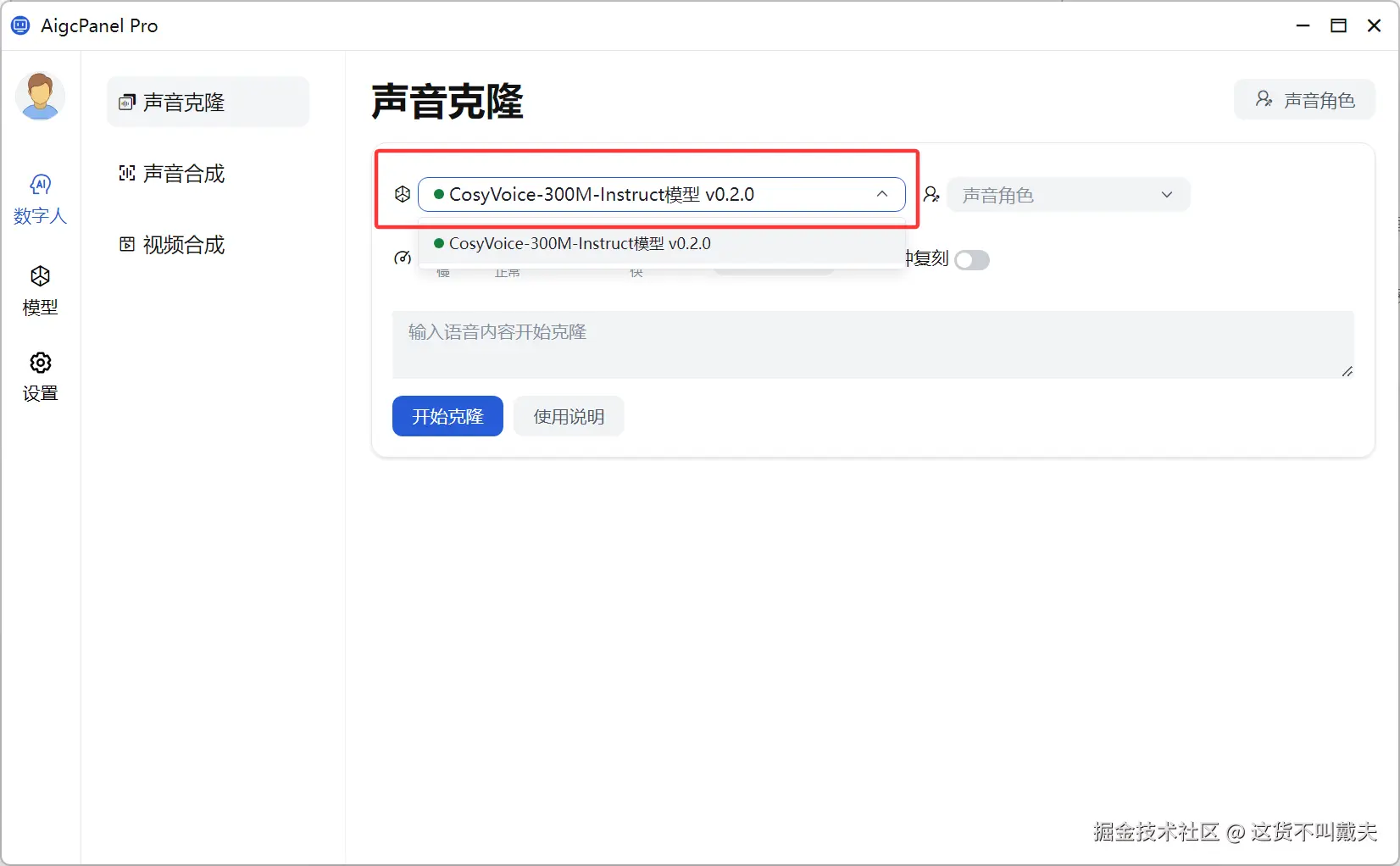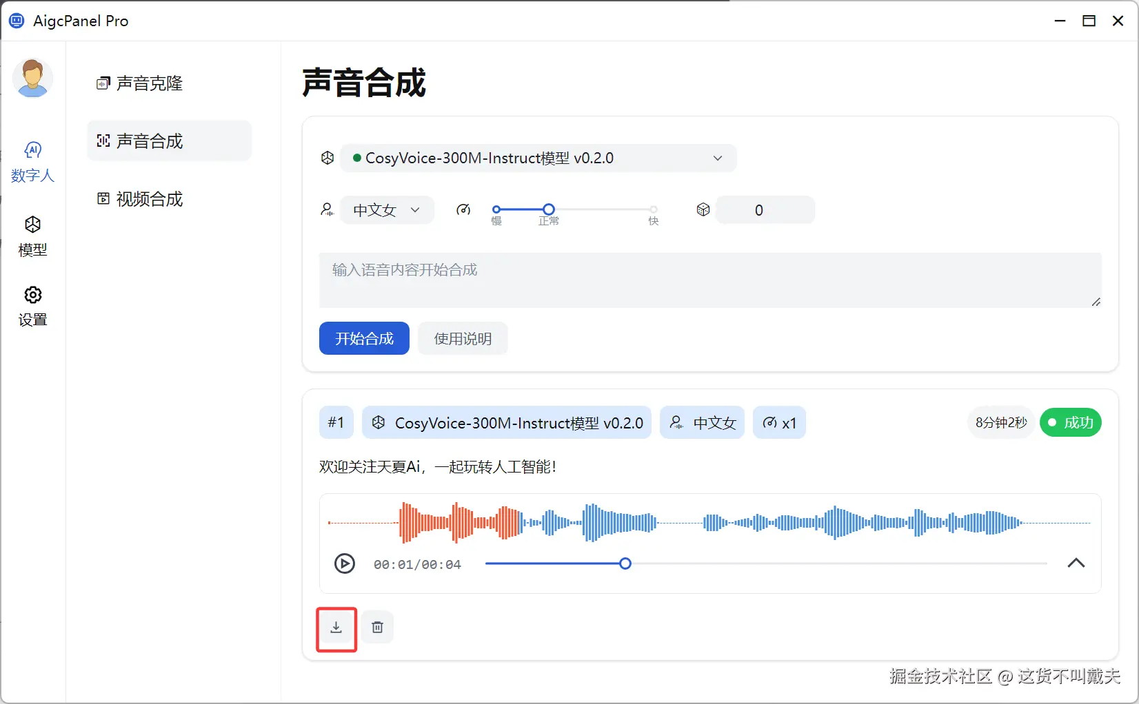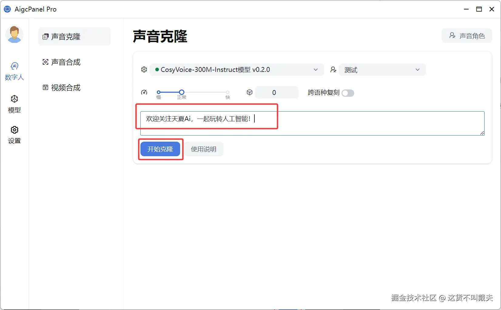 - 声音克隆与合成:AigcPanel的声音克隆功能能够捕捉并复制特定个体的声音特征,包括语调、语气、节奏等,实现声音的克隆和还原。此外,它还能将文本转换为自然流畅的语音,支持多种声音参数设置,满足用户对于不同声音风格和表现力的需求。