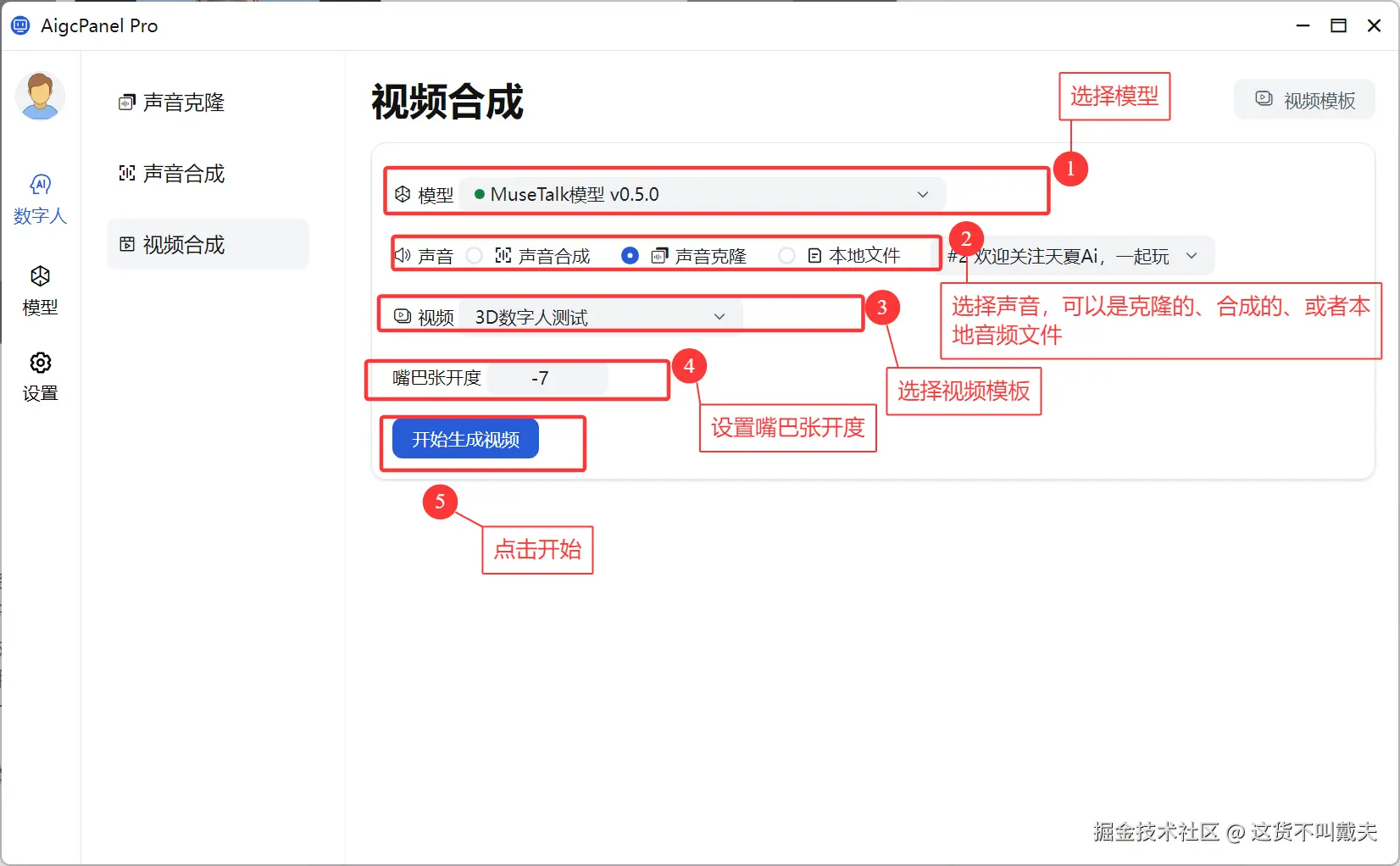 - 视频合成:AigcPanel支持视频数字人合成,能够将AI生成的数字人形象与视频画面完美结合。用户可以根据需要对视频进行剪辑、拼接和特效处理,制作出高质量的合成视频。同时,系统还支持视频画面和声音换口型匹配,实现智能音视频同步优化,让数字人的表现更加自然流畅。
