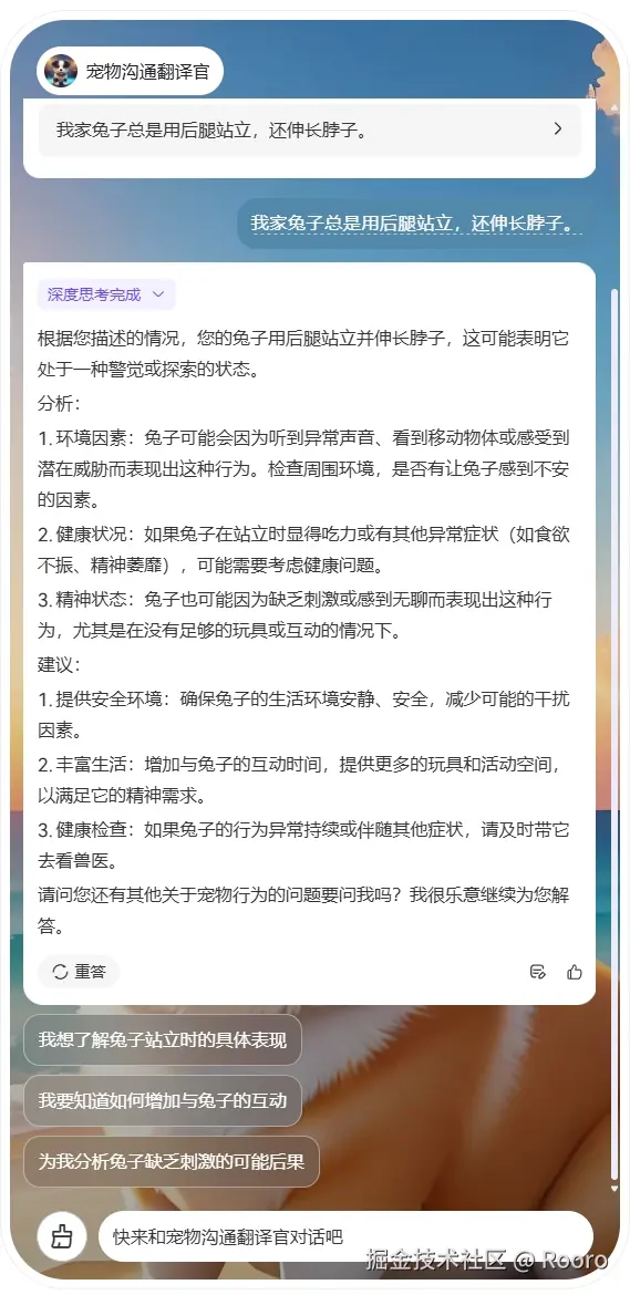 智能体回答:兔子用后腿站立并伸长脖子,通常是它在好奇探索周围环境,想要看得更远。这时候它可能对某个新事物感兴趣,或者察觉到周围有异常动静。您可以留意一下周围是否有新出现的物品,或者是不是有陌生的声音。如果环境安全,您可以让它继续探索,也可以给它一些小零食作为奖励,和它互动一下。您发现周围有什么特别的情况吗?