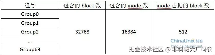 这个示例中hdd1中一共包含1048576个inode节点(inode编号从1开始),每个inode节点大小为128字节,所有inode消耗的存储空间是1048576×128=128MB;总共包含2097065个block,每个block大小为4096字节,每32768个block组成一个group,所以一共有2097065/32768=63.99,即64个group(group编号从0开始,即Group0~Group63)。所以整个/dev/hdd1被划分成了64个group,详情如下: