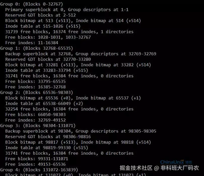 用block号分别除以32768就得到了备份superblock的Group号,和我们在上面看到的结果一致。我们来看一下/dev/hdd1中Group和block的关系: