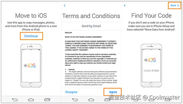 步骤 2. 在Android手机或平板电脑上,打开“移至iOS应用程序。同意条款和条件,然后点击“下一步”继续。