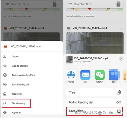 步骤 2. 在 iPad 上打开 Google 云端硬盘,然后使用您在Android上使用的同一 Google 帐户登录。找到您需要下载的文件,然后点击三点图标,选择“发送副本”以将文件保存在您的 iPad 上。
