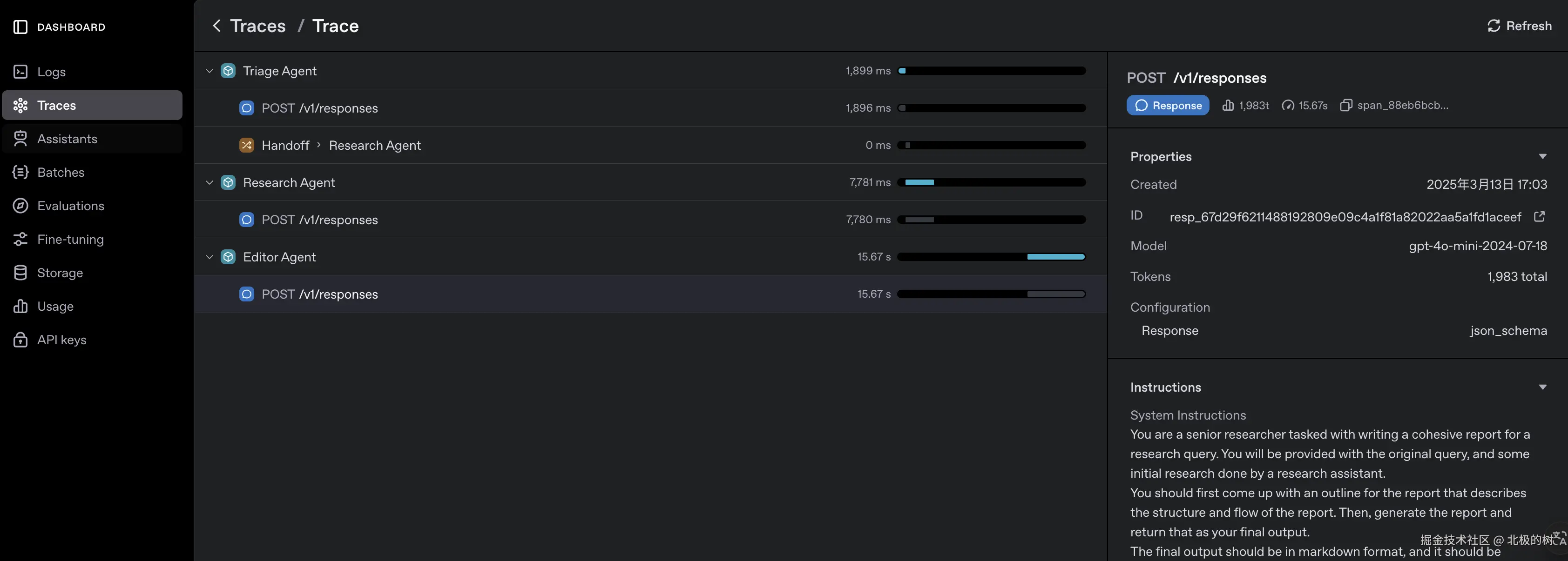 在开发Agent应用时,开发者可以专注于业务工作流的设计,Agent SDK会负责大部分的底层调度工作——处理工具调用、将结果传递给LLM并执行循环。因此,工作流的可观测性非常重要,它能帮助开发者清晰了解哪里出了问题,如何优化工作流,这就是Tracing(任务状态跟踪)的能力。OpenAI在官方工作台中提供了一个追踪面板,开发者可以在其中可视化所有代理的行为——例如代理何时调用工具、收到哪些输入、生成了哪些输出。