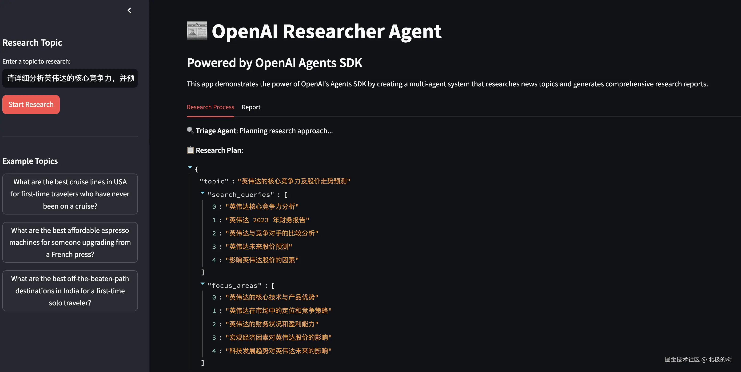 triage_result能自动根据输入的主题先调用research_agent搜索主题相关的信息,再调用editor_agent总结成报告。最后我们再使用指的是Streamlit做一个漂亮的web界面。效果如下(第一张是research_agent的结果,第二张是editor_agent的结果):