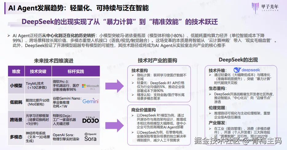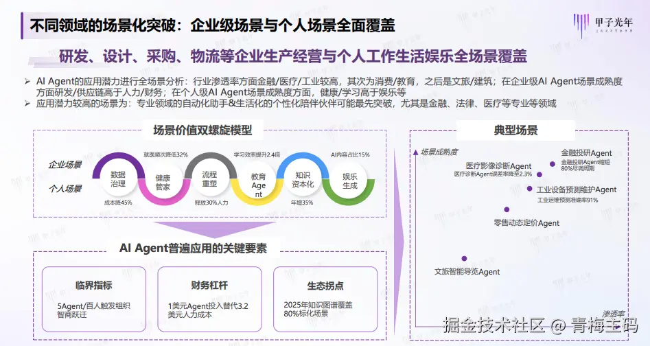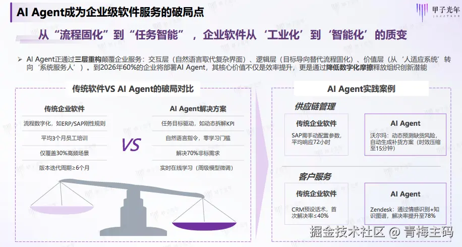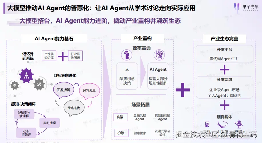 AI Agent 正在重塑从工业流水线到个人生活的每一个角落。这场变革不仅是技术的胜利,更是人类协作方式的进化。正如甲子光年所言:“未来企业的 DNA 将由流程智能化与知识资本化重新定义。 ”在这场革命中,抓住 AI Agent 的机遇,即是抓住下一个十年的生产力密码。
