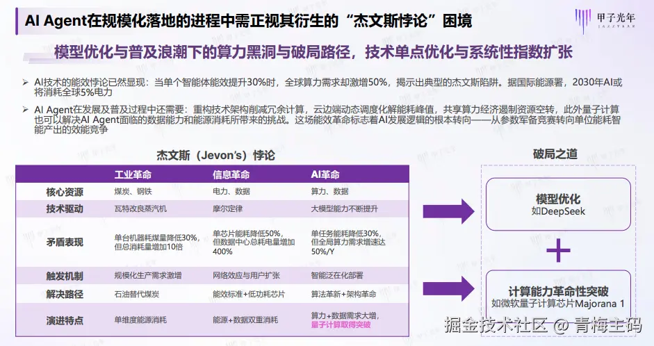 AI Agent 的普及带来算力“黑洞效应”。单任务能耗虽降低 30%,但全局需求增速达 50%/年,2030 年 AI 或将消耗全球 5% 的电力。破局路径包括: