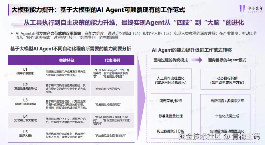 - L1-L5 分级跃迁:报告将 AI Agent 的自主性分为 5 级:从简单步骤跟随(L1)到具备数字人格(L5)。例如,L4 级 Agent 能基于用户历史行为主动提供个性化服务,L5 级 Agent 甚至可代表用户进行商务谈判。