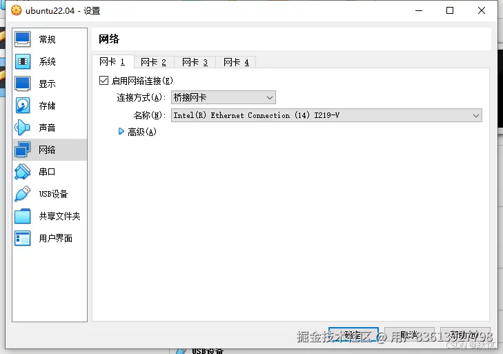 8.选择左边网络选项,连接方式选择桥接网卡。点击确定完成配置