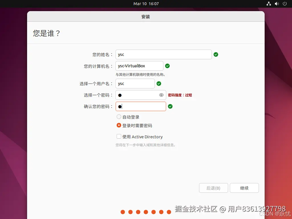 17.设置你的用户名和密码,密码提示过短可以不用理会。设置完成后点击继续,等待虚拟机安装完成即可,安装完成后选择重启,重启后需要手动回车,才可以进入Ubuntu虚拟机,但此时的虚拟机放大可能显示有一点问题,需要安装增强功能。