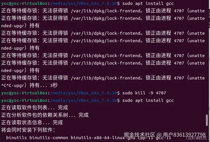 (2)如果在执行上述命令时显示的打印信息和下面图片第二次执行sudo apt install gcc的打印信息不相似,则说明环境安装异常,如果异常信息和下图中的打印信息“正在等待缓存锁:无法获得锁 /var/lib/dpkg/lock-frontend。锁正由进程 4707(unattended-upgr)持有”。则如下图所示,执行命令sudo kill -9 4707,4707代表的打印信息中的进程号4707