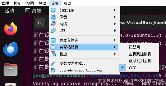 完成后关闭虚拟机,可以直接点击右上角的“x”符号,选择强制退出,然后再重新启动虚拟机。重启之后虚拟机与windows之间就可以相互复制粘贴了,但如果执行下图中的命令提示权限不够,则根据下面a,b两种解决方式处理后,重启虚拟机即可。 “sf_Ubuntu22.04”是sf_+共享文件夹名字,不同用户下此路径不一定相同。