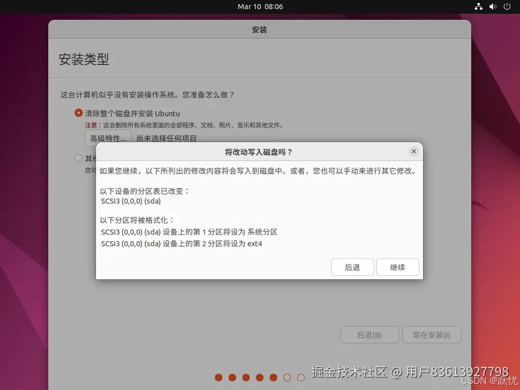 14.默认清楚整个磁盘并安装Ubuntu,但这里的磁盘是指分配给虚拟机的磁盘大小,并不是指电脑的全部磁盘。