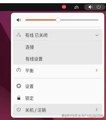 b.查看虚拟机的右上角是否有网络连接表示,如图二的箭头所指图标,如果没有则将鼠标滑到虚拟机右上角的声音图标,选择有线已关闭,点击连接即可;