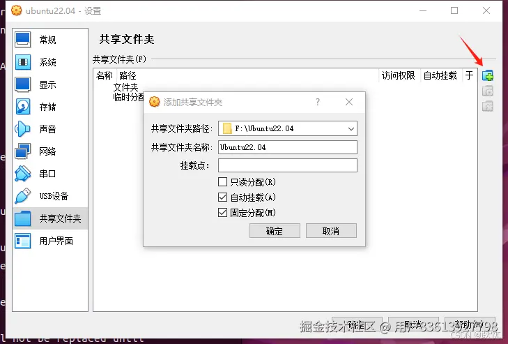 在弹出的窗口中点击窗口右边的绿色加号图标,如下图红色箭头所指,在新弹出的窗口选择共享文件夹路径和勾选自动挂载+固定分配。