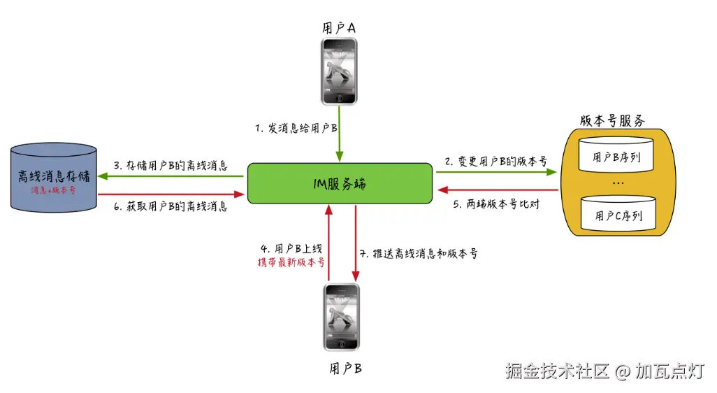 设备A版本号:1001 → 发送消息 → 服务端生成版本号1002