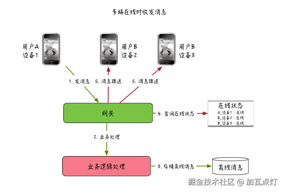 想象每个登录设备都是一个独立通讯员:当用户同时在手机、电脑、平板登录时,服务端会为每个设备维护独立的通信通道。发送方发出的消息会像广播电台一样,同时推送到接收方的所有在线设备。