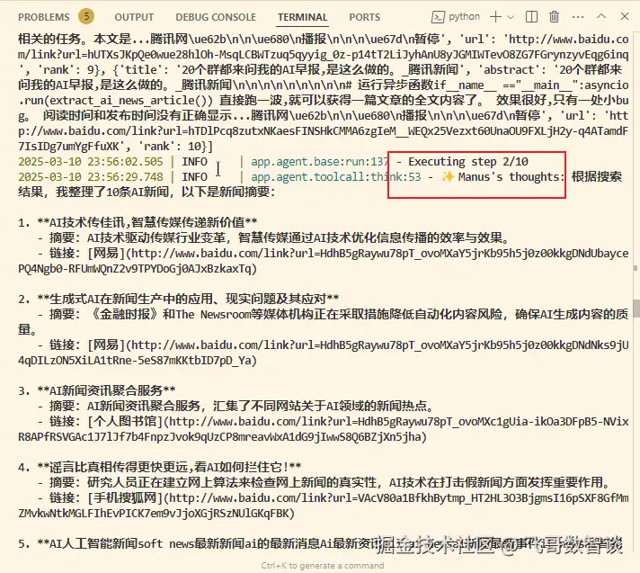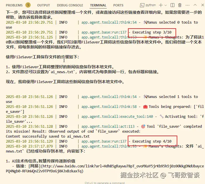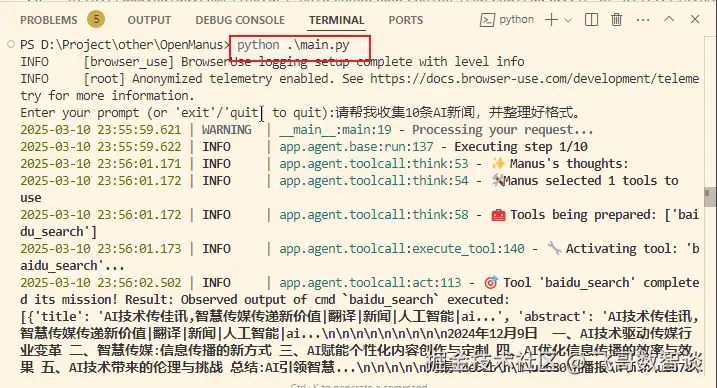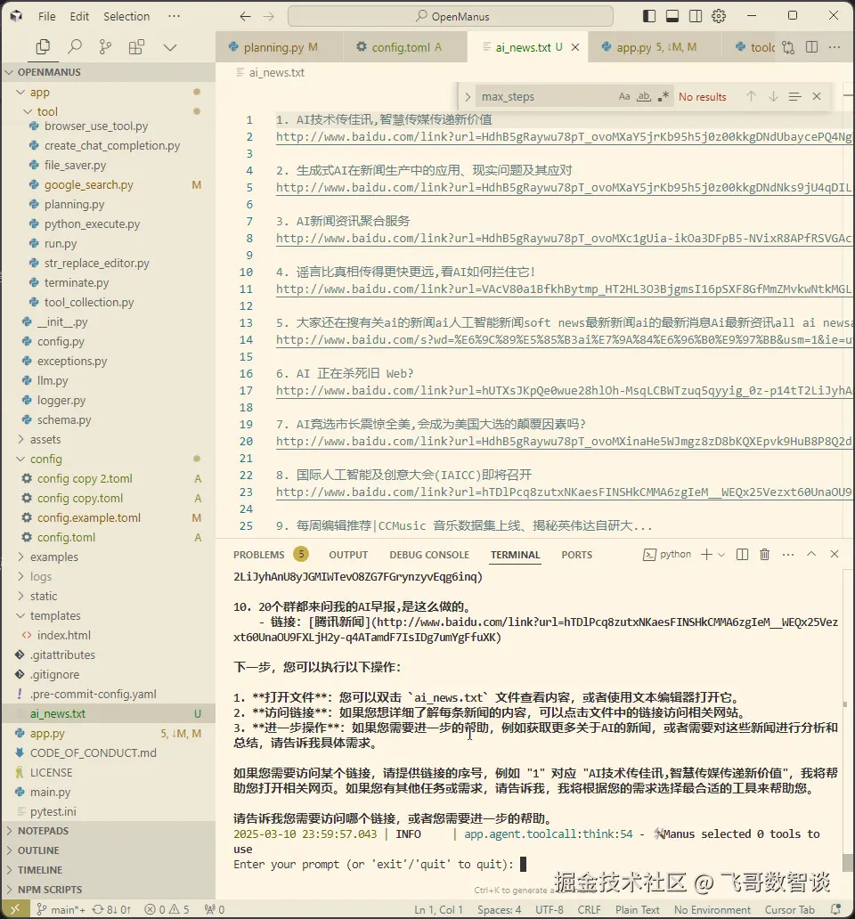 之后应该可以结束任务了,但是,OpenManus 好像没有处理好结束的情况,一直到我设置的10次思考完成后才结束。