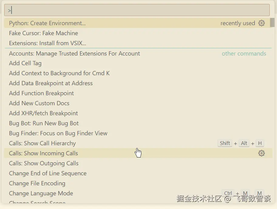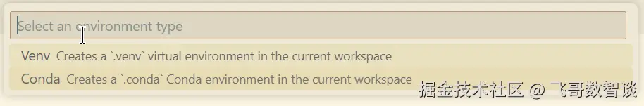 键盘输入快捷键“Shift+Ctrl+P”打开命令面板,选择“Python:Create Environment”创建Python环境。