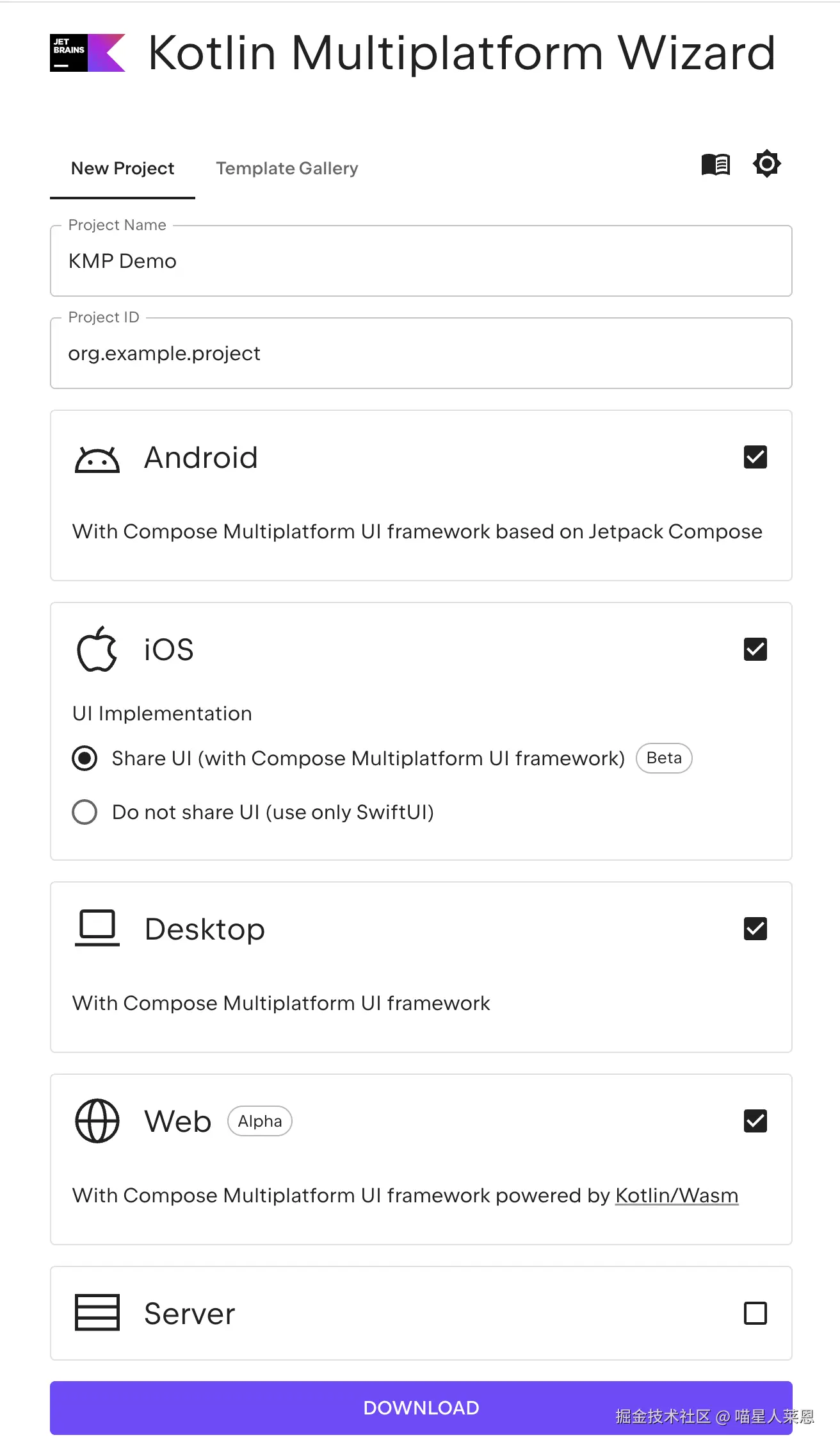 JetBrains已经给我们提供了一键生成脚手架:Kotlin Multiplatform Wizard | JetBrains,我们直接用上创建第一个 Demo
