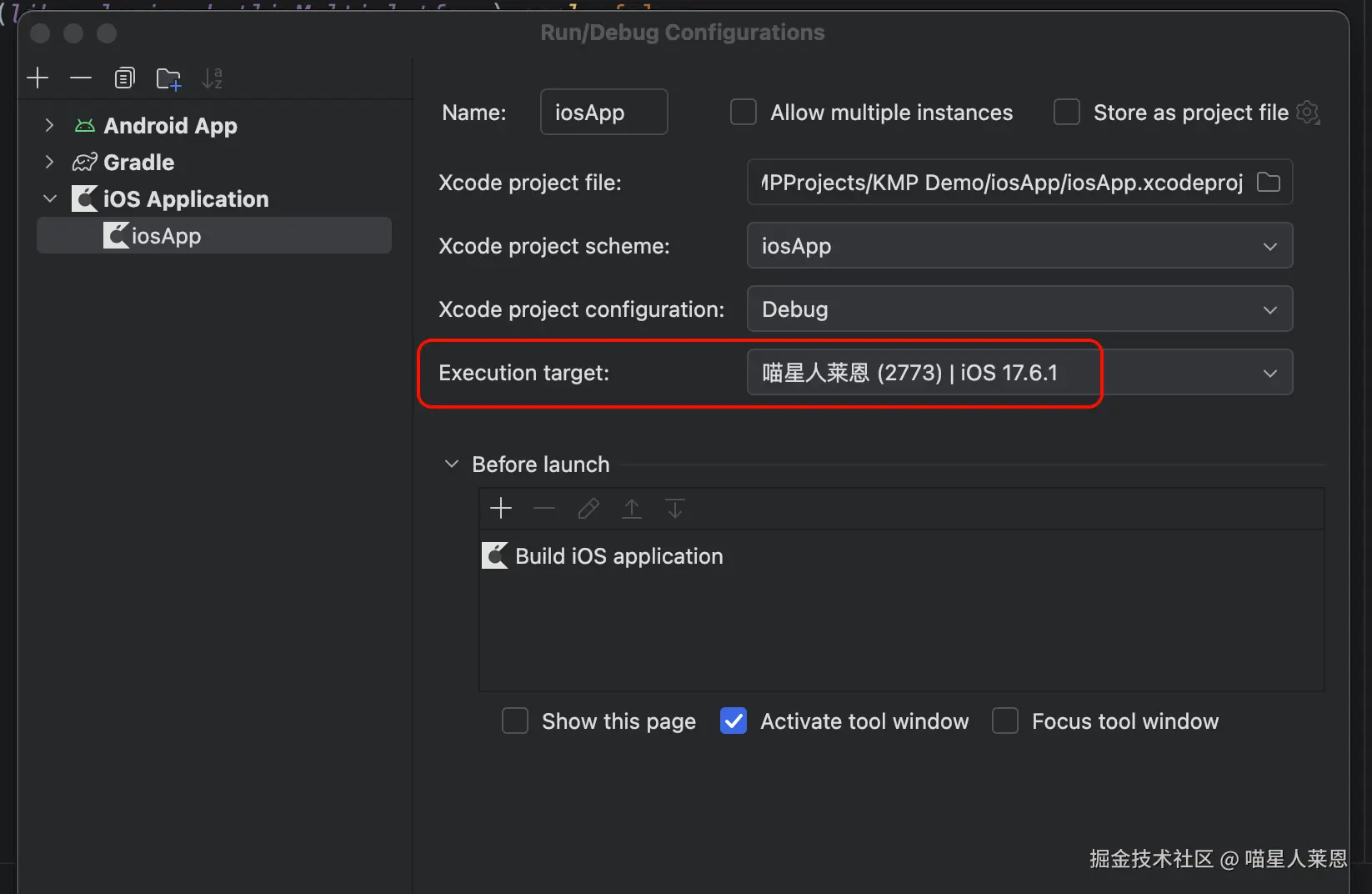 在run configurations选择或新建 iOS Application config,Execution target选择你联线的真机或者模拟器