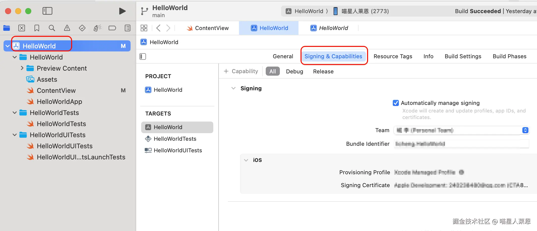 点击项目名进入项目设置,Signing 这里加入 Team 和签名,具体其实我也不太明白,总之一路登录就是了