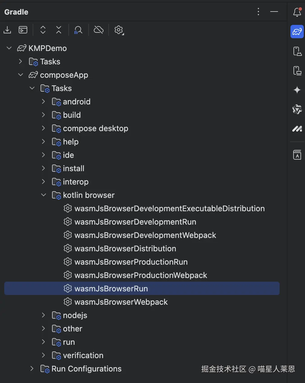勾选想要的平台后下载工程并打开,等待 gradle 运行完,run configurations中选择 composeApp,就可以直接编译运行到 Android 上了