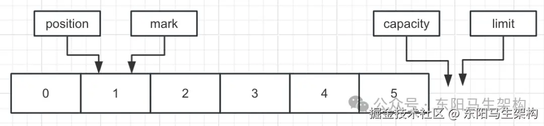 Buffer缓冲区本质上是一个数组。通常它是一个字节数组ByteBuffer,当然还有其他基本类型的数组如CharBuffer。Buffer缓冲区不仅仅是一个数组,还可以对数据进行访问和对读写位置进行维护。所以Buffer缓冲区引入了4个核心概念:capacity、limit、position、mark。