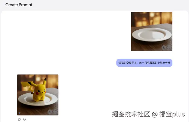 我让gemini生成一个空盘子给我,然后给我的空盘子上,放一只毛茸茸的小型皮卡丘。