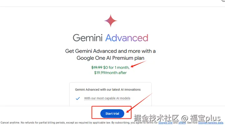 (2)接下来就是绑定到Google Gemini,进行一个订阅。订阅之后进行取消,新用户都有免费试用一个月的Gemini Pro,不过使用之前都需要你绑定支付方式。点击【开始试用】