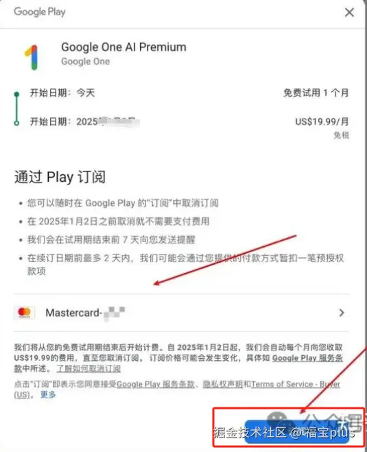 (5)保存之后,就可以选择你的卡号进行一个订阅,就可以开通免费使用Gemini Advanced Pro 服务啦。