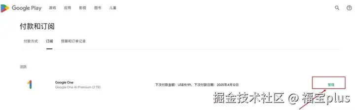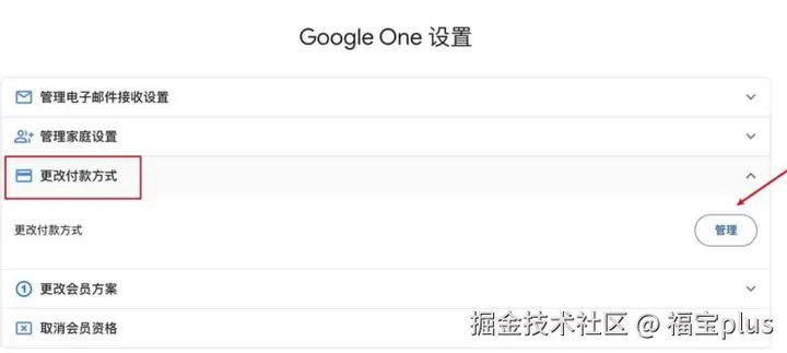 (7)在Google One上选择【更改付款方式】,点击【管理】,就会显示你的绑定信息,接着再点击订阅订阅信息的【管理】。