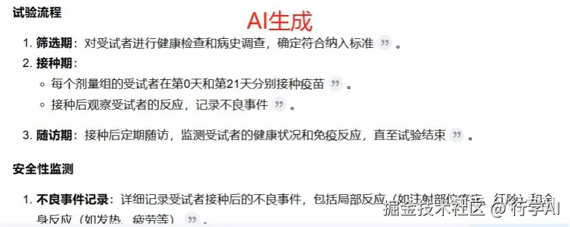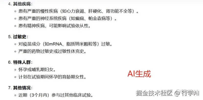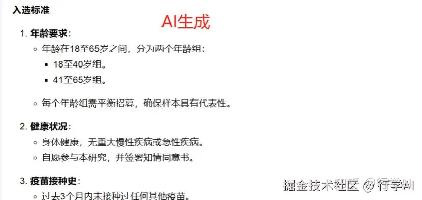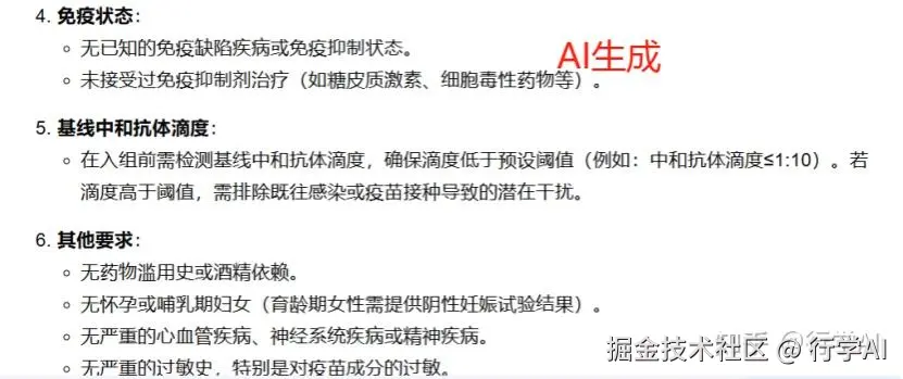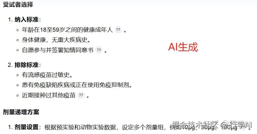 比如我们想要了解受试者选择部分的详细信息,我们可以对指令prompt进行优化:“请生成满足以下条件的入选标准:年龄分层:18-40岁组/41-65岁组需平衡招募;排除标准需包含:3个月内接种过其他疫苗/已知免疫缺陷疾病;特殊要求:需检测基线中和抗体滴度阈值”