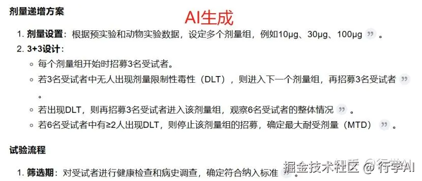 步骤1: 我们在AI系统界面输入指令prompt:“ 请生成一份临床试验设计:疾病:H5N1流感,干预:mRNA疫苗(代号VX-202), 阶段:Ⅰ期,设计类型:剂量递增(3+3设计) ”