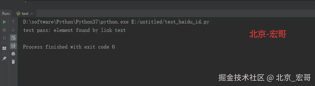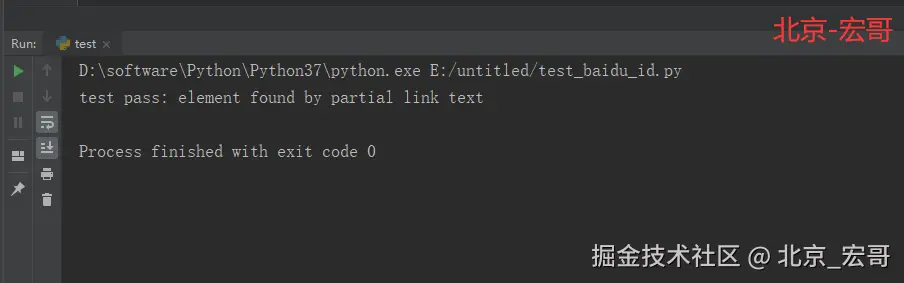 为了更好的验证是否找到了“把百度添加到首页”这个元素,我在这个地方添加了一个click(),运行代码,可以看到确实点击了这个元素,代表找到了这个元素。选择partial link text的时候,需要选择一个比较唯一的字段,来区分这个元素。